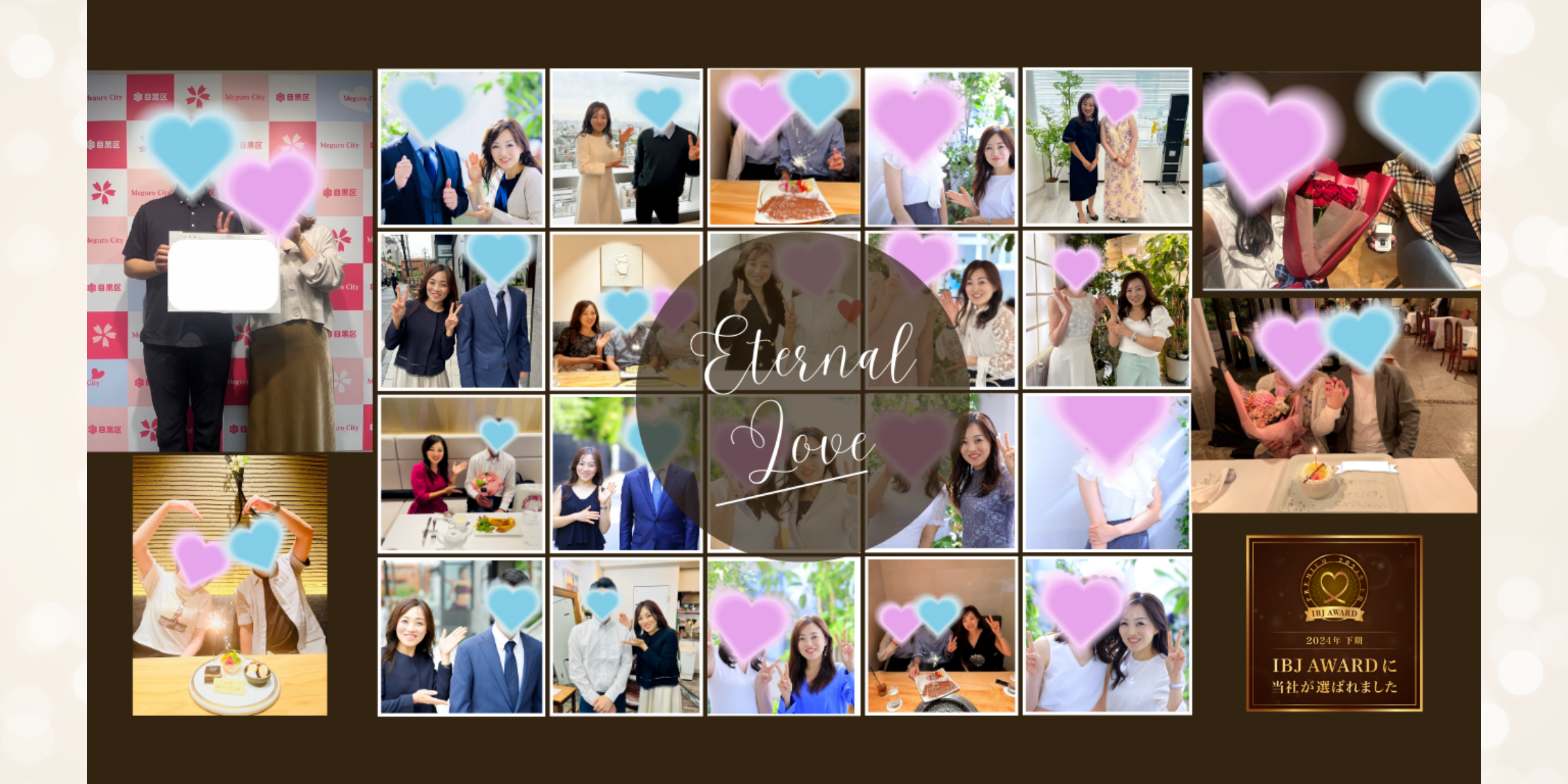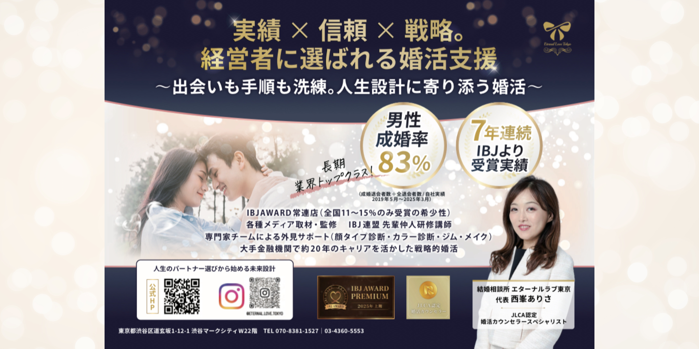 エターナルラブ東京は7年連続、様々な賞を受賞中(受賞率全国11~15%のIBJ AWARD、成婚優秀賞、入会優秀賞等)。業界トップクラス成婚率83%(男性)、お見合い料無料、会員数約10万人以上! 東証プライム市場上場 IBJに正規加盟、IBJ先輩仲人研修講師を務めさせて頂いております。渋谷駅直結渋谷マークシティに拠点。「婚活はモチベーション」をモットーに専門家による外見磨きサービスの充実、お相手様の心の琴線に響くプロフィール作成、お相手様のご紹介、お見合いの設定、ご交際、プロポーズ、ご成婚まで一貫して代表自身がサポートしております。会員様に真摯に誠実に寄り添い、人生設計型婚活による「幸せ短期成婚」をお手伝いします。